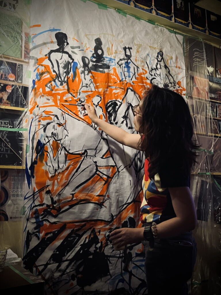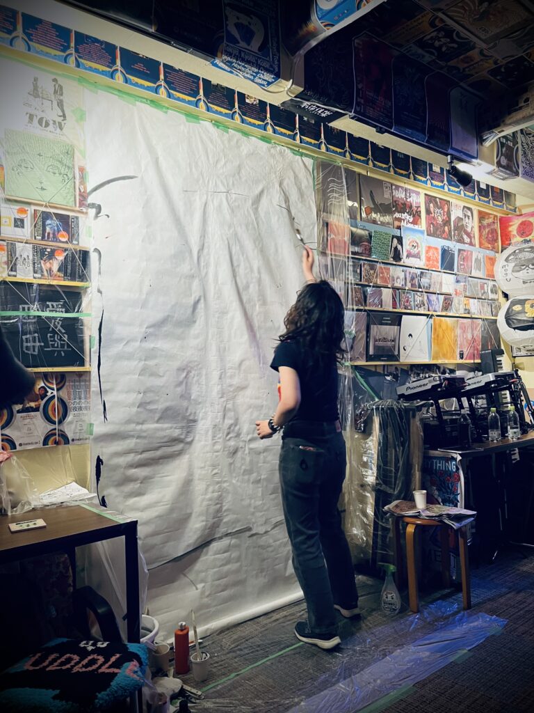 前回は100号くらいの作品に挑戦して、自分の背丈より大きい画面をどんどん埋めていきました。今回も、墨や日本画の材料を使って、大きくダイナミックに描く予定です。ライブならではの空気を感じてもらえると思います。